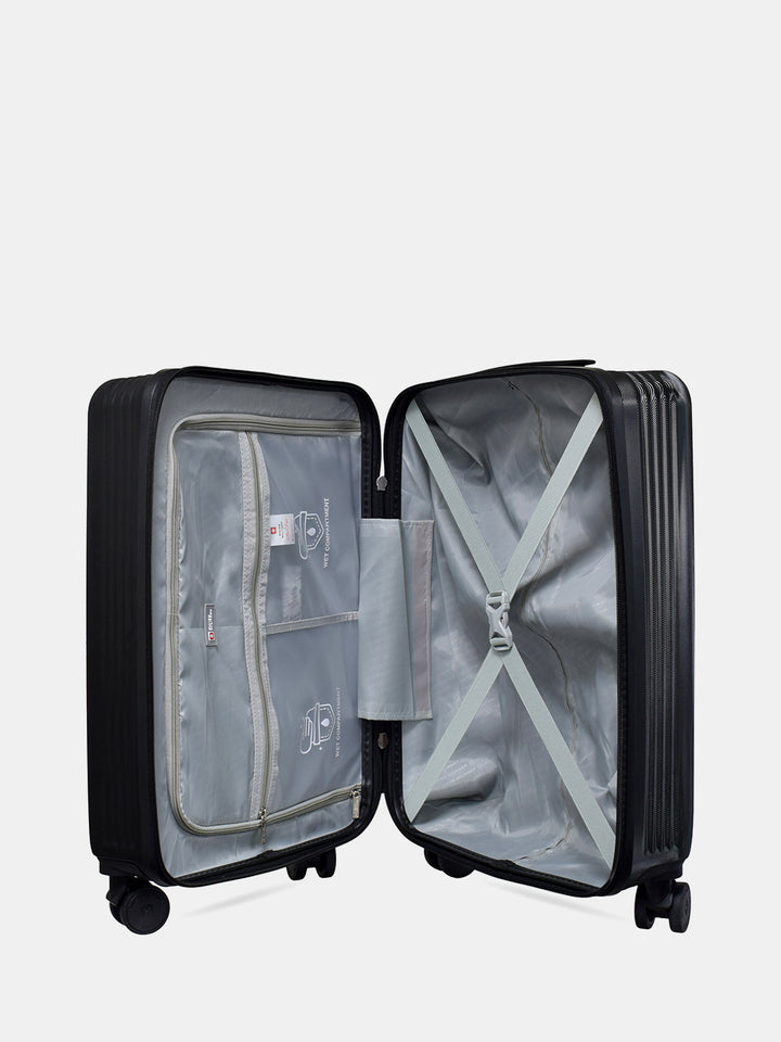 Equipped with ergonomic 360° rotatable spinner wheels and a strong push-button aluminium trolley handle, the Lithane series ensures effortless manoeuvrability across airports, railway stations, and city streets. The inbuilt embedded number lock offers enhanced security, while premium smooth zippers and branded metal pullers add reliability. Inside, you’ll find premium branded lining, an elastic separator compartment, and a zipper organiser pocket with a wet leak-proof pouch, helping you stay organised and pack efficiently.